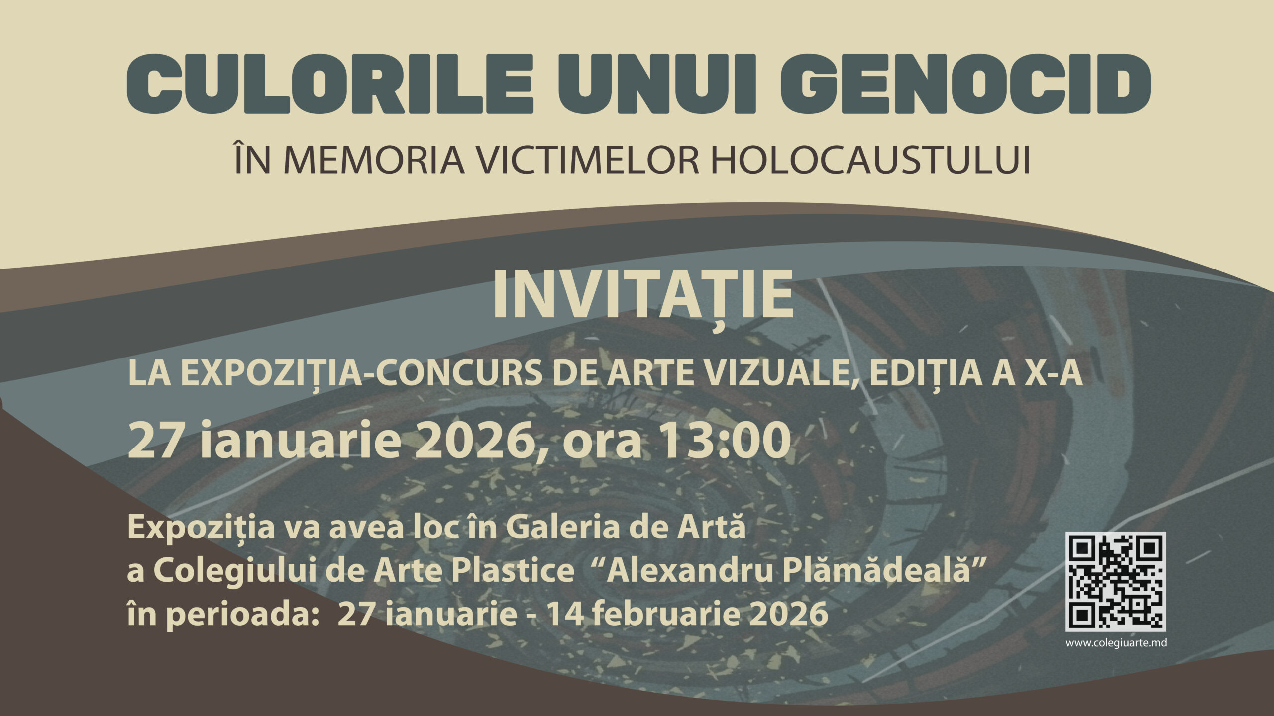 În contextul Zilei Internaționalede comemorare a Victemelor Holocaustului IP Colegiul de Arte Plastice ”Alexandru Plămădeală” vă invită la vernisajul Expoziției-concurs de arte vizuale: ”CULORILE UNUI GENOCID” ÎN MEMORIA VICTEMELOR HOLOCAUSTULUI.Expoziția are...